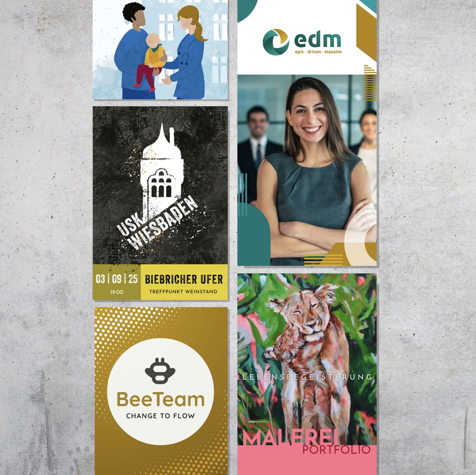 Eine Illustration (oder Infografik :-) schafft, was Worte nicht vermögen: nonverbal blitzschnell zu kommunizieren! Ob Flat-Design im Vektor-Format (Adobe Illustrator) oder handgezeichnet auf dem Tablet(Procreate) – ich unterstütze dich gerne dabei das Bild aus deinem Kopf auf die Leinwand zu kriegen und es ggf. auch zu animieren (Adobe Animate)!